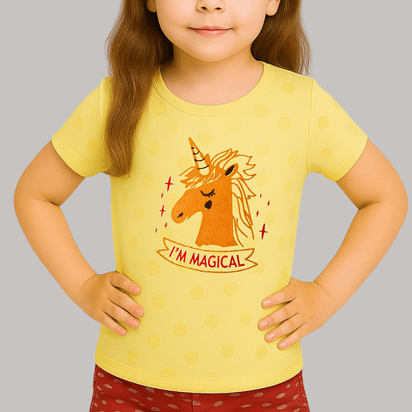 This yellow unicorn T-shirt is made of cotton jersey fabric which is a versatile and widely love fabric. It feels smooth against the skin and offer excellent breathability.